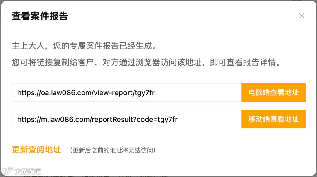 无需下载APP,只需通过您分享的链接,即可在手机浏览器或微信中实时查看案件的最新进展报告。