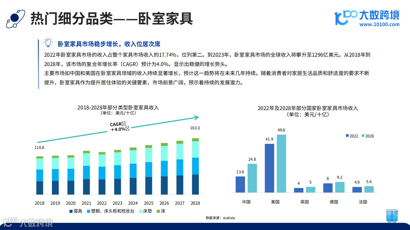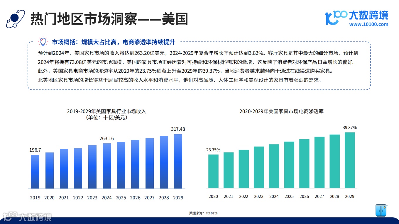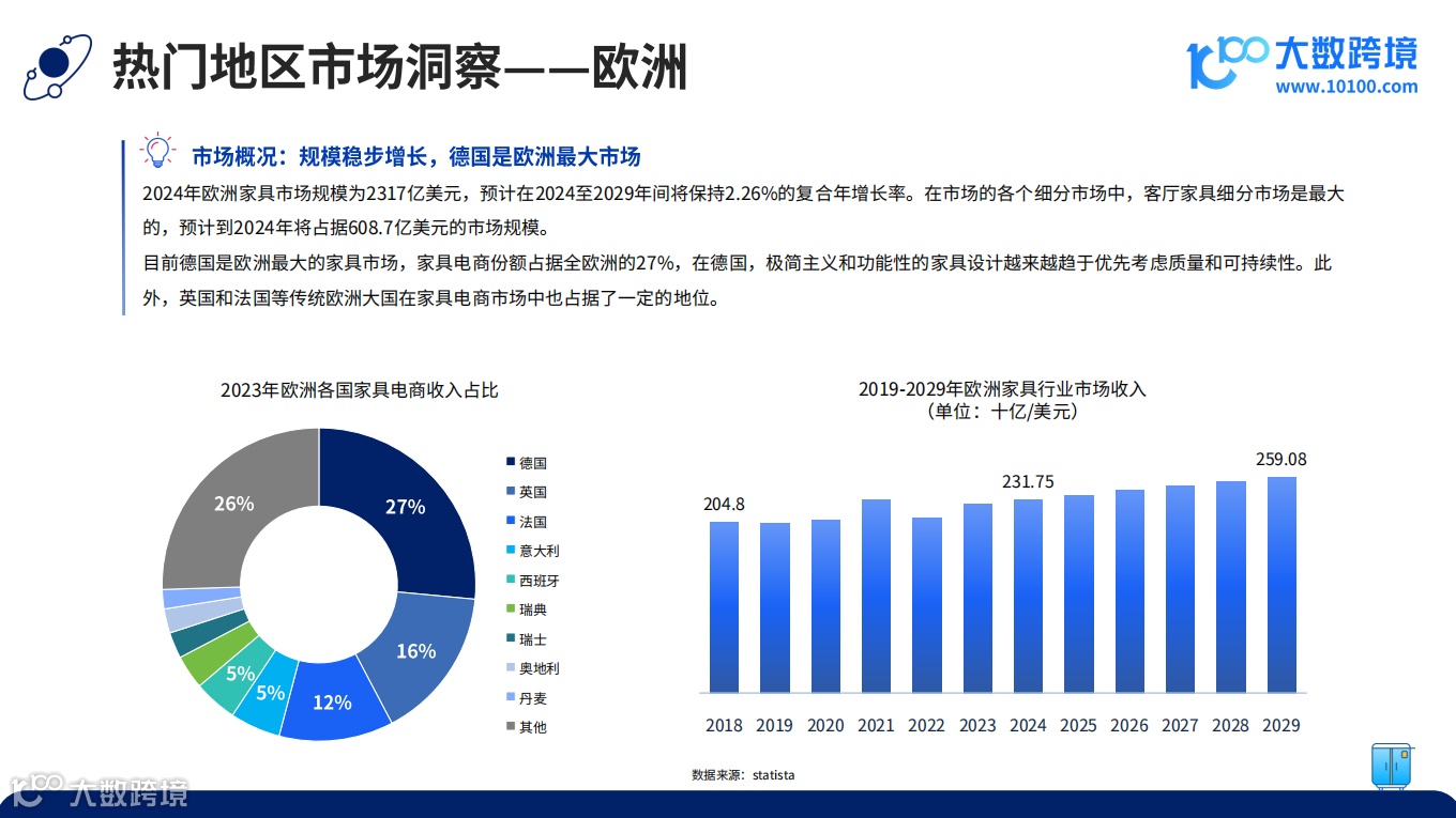 欧洲市场:2024年欧洲家具市场规模为2317亿美元,预计在2024至2029年间将保持2.26%的复合年增长率。德国是欧洲最大的家具市场,家具电商份额占据全欧洲的27%,在英国和法国等传统欧洲大国在家具电商市场中也占据了一定的地位。
