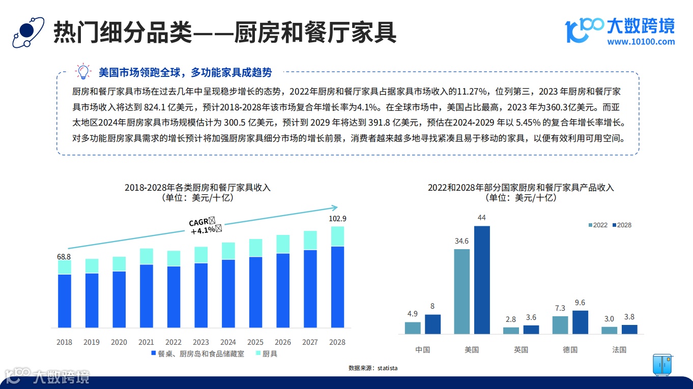 厨房和餐厅家具市场在过去几年中呈现稳步增长的态势,2022年厨房和餐厅家具占据家具市场收入的11.27%,位列第三。到2023年,厨房和餐厅家具市场收入将达到824.1亿美元,预计到2029年将达到391.8亿美元。在全球市场中,美国占比最高,亚太地区也表现出强劲的增长潜力。