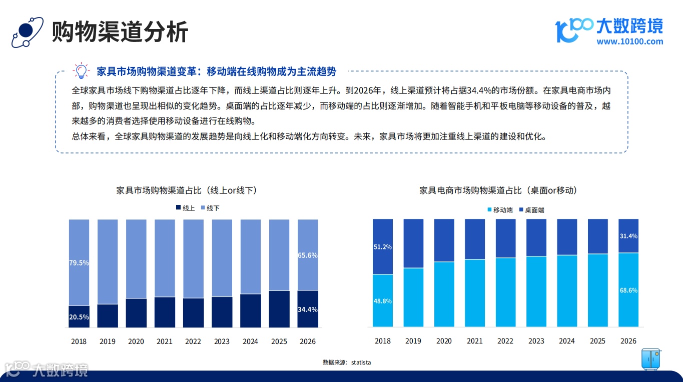全球家具购物渠道的发展趋势是向线上化和移动端化方向转变。到2026年,线上渠道预计将占据34.4%的市场份额。在家具电商市场内部,购物渠道也呈现出相似的变化趋势。桌面端的占比逐年减少,而移动端的占比则逐渐增加。未来,家具市场将更加注重线上渠道的建设和优化。