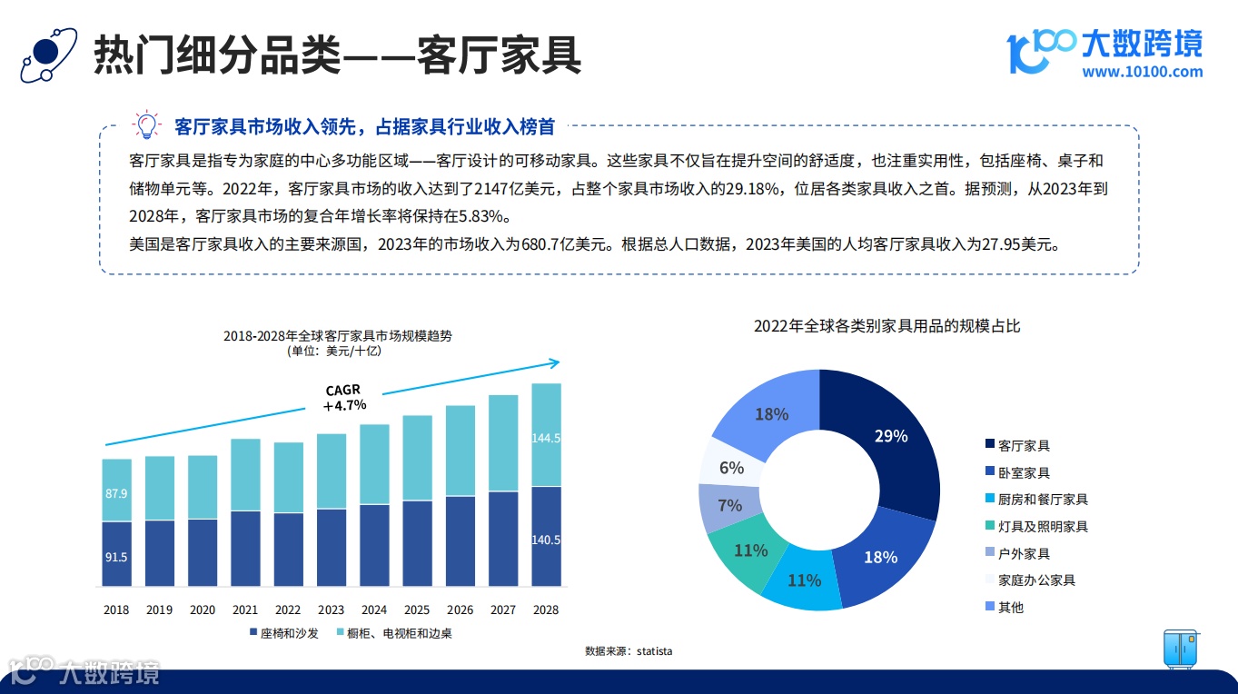 随着全球化的不断深入和消费者生活方式的日益多元化,家具市场正迎来前所未有的发展机遇。从传统的手工艺制作到现代的智能制造,家具不仅是居家生活的必需品,更成为了文化传承和个人品味的展现。当前,全球家具市场规模的持续扩大,不仅反映了人们对于生活质量追求的提升,也预示着巨大的商业潜力和发展空间。大数跨境旨在为您提供一份深入的行业洞察,分析全球家具市场的现状、发展趋势以及面临的挑战。通过对市场数据的细致梳理和未来趋势的科学预测,我们希望能够帮助您把握行业发展的脉搏,识别潜在的增长点,从而在竞争激烈的跨境电商市场中占据先机。