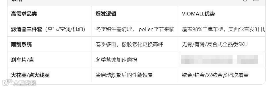 美国市场差异化:南部州(德州、佛州):空调滤清器、冷却系统件需求更早启动。