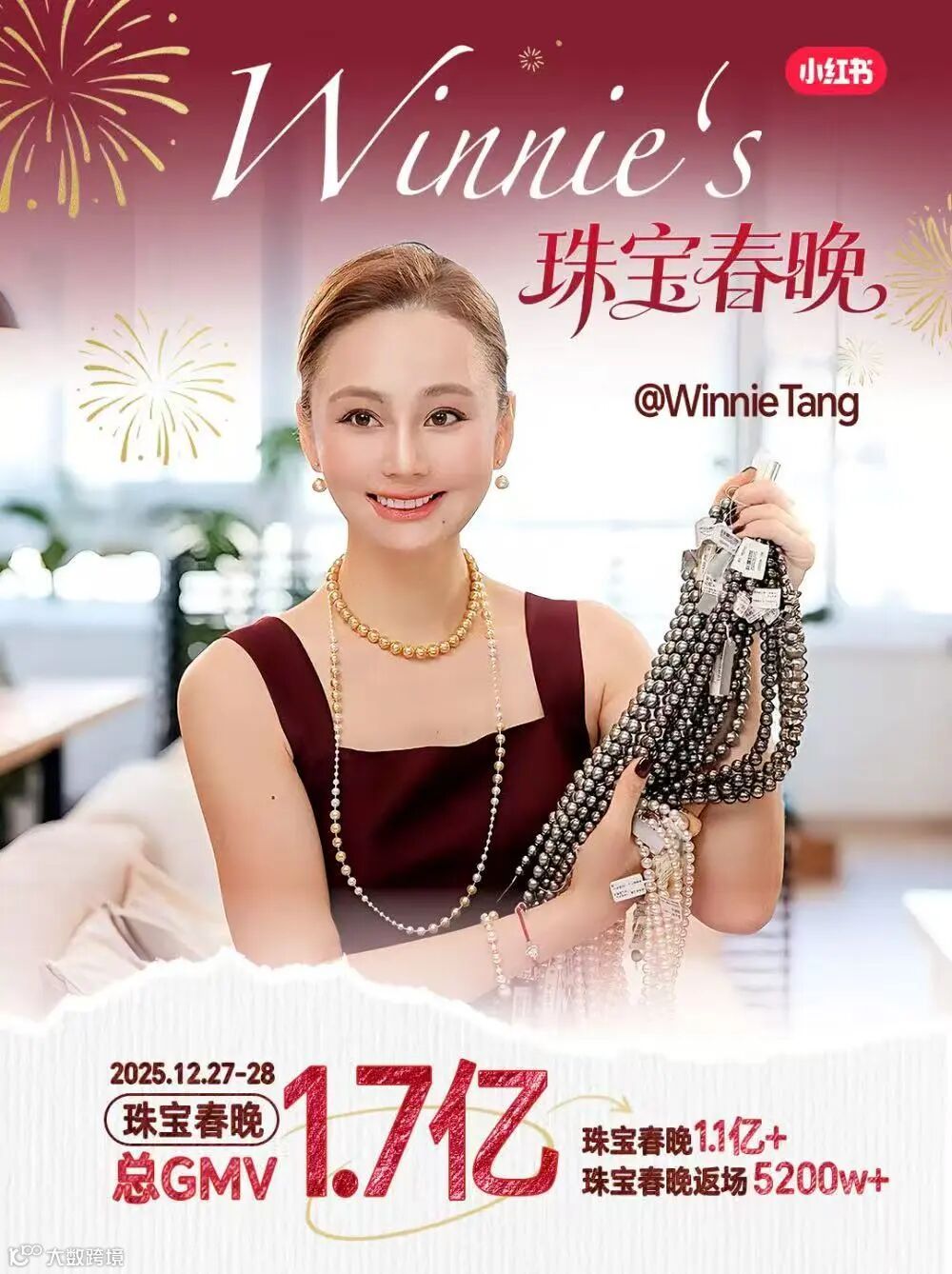 2025年12月27—28日,时尚博主@Winnie Tang 开展为期两天的珠宝直播,覆盖珍珠、和田玉、培育钻、翡翠等品类,上架SKU超2000个。首日销售额达1.13亿元,双日总GMV突破1.7亿元,刷新小红书珠宝单场纪录与素人买手纪录。客单价高达1.8万元,周大福、名皇珠宝等15个品牌销售额破百万。
