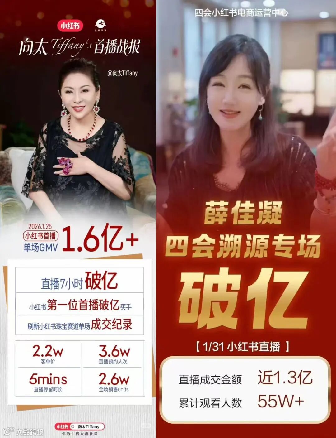 2026年开年,向太陈岚与演员薛佳凝接连交出亮眼成绩单:1月25日,向太首次登陆小红书,开播7小时GMV破亿,最终达1.6亿元,登顶买手榜第一,成为平台首位首播即破亿的明星买手;1月31日,薛佳凝同样登顶买手榜,GMV近1.3亿元。