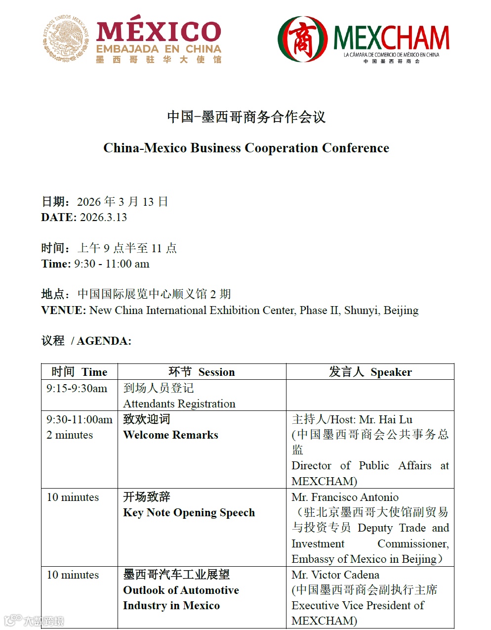 中国墨西哥商会(MEXCHAM)诚邀您参加将于2026年3月13日在北京举行的中国-墨西哥商务合作会议。本次会议是中国国际新能源汽车技术、零部件及服务展览会(CINEVE)的同期会议。