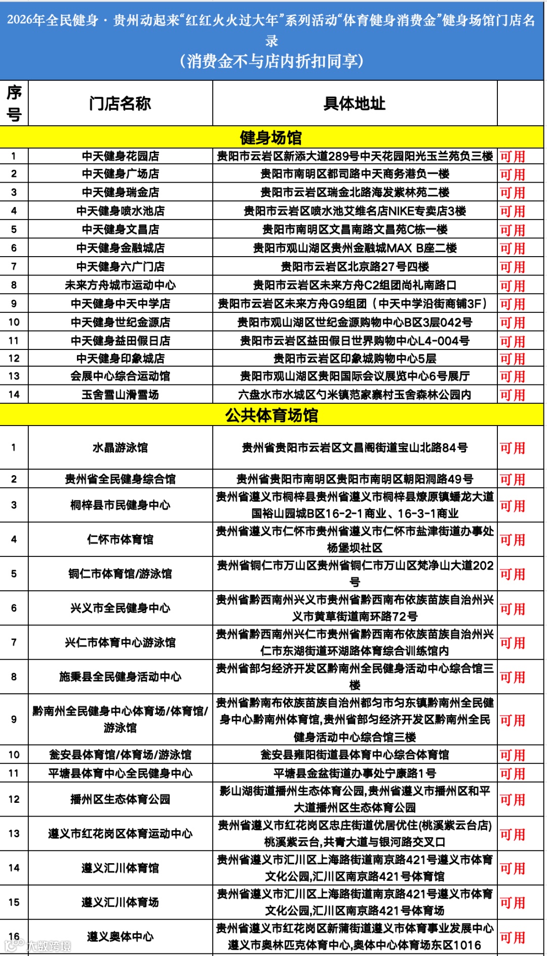 ✅线下:贵州省内指定公共体育场馆、商业健身场馆、滑雪场、体育用品零售门店和体育培训场馆,每次消费可抵扣实际消费额的20%。