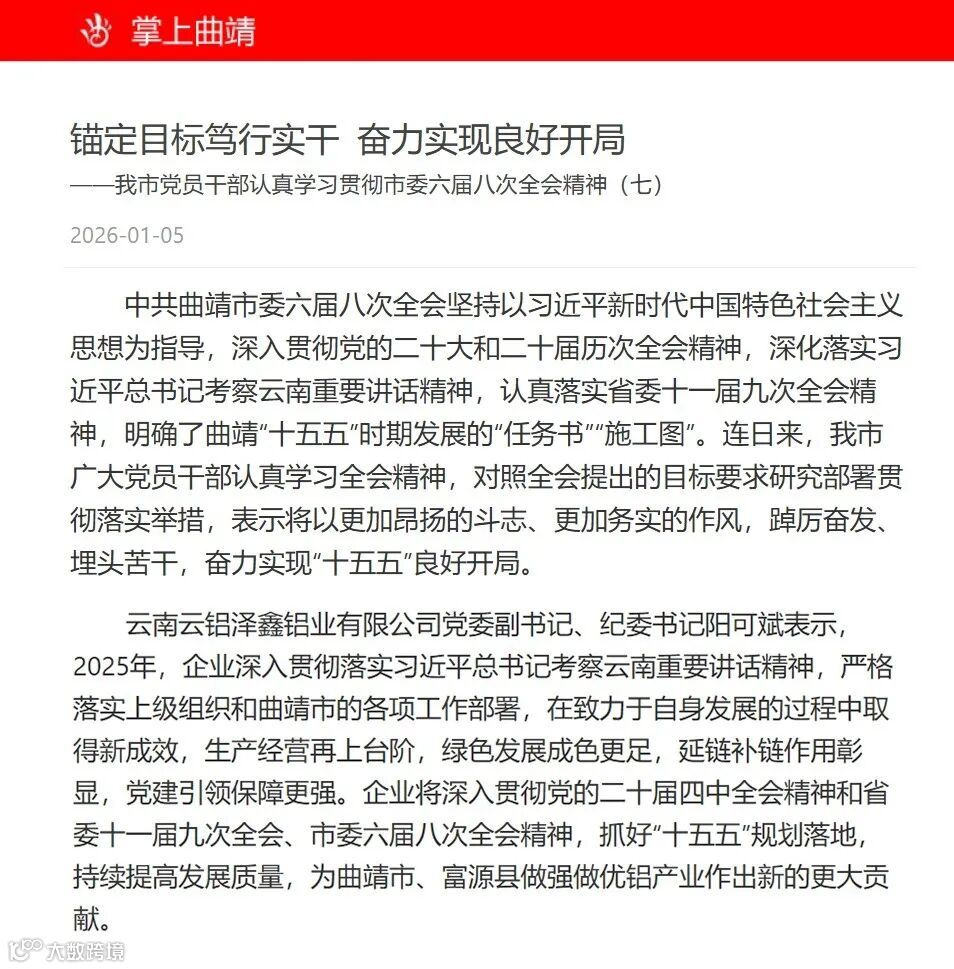 掌上曲靖以《锚定目标笃行实干 奋力实现良好开局——我市党员干部认真学习贯彻市委六届八次全会精神(七)》为题,报道了云铝泽鑫立足发展大局,持续推动生产经营提质增效、深化绿色低碳发展、强化铝产业延链补链,为当地铝产业转型升级、经济高质量增长注入强劲动能,助力曲靖做强做优铝产业集群。