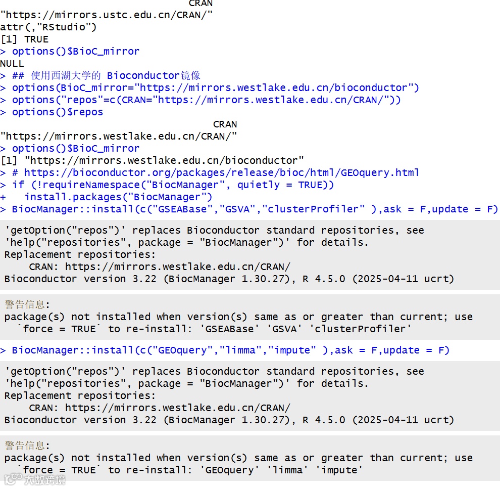 file.edit("~/.Rprofile"),用这句代码打开配置文件,然后粘贴:options(BioC_mirror="https://mirrors.westlake.edu.cn/bioconductor")options("repos"=c(CRAN="https://mirrors.westlake.edu.cn/CRAN/"))教程:https://mp.weixin.qq.com/s/28CqVIikC6rOF97HNFcb7g