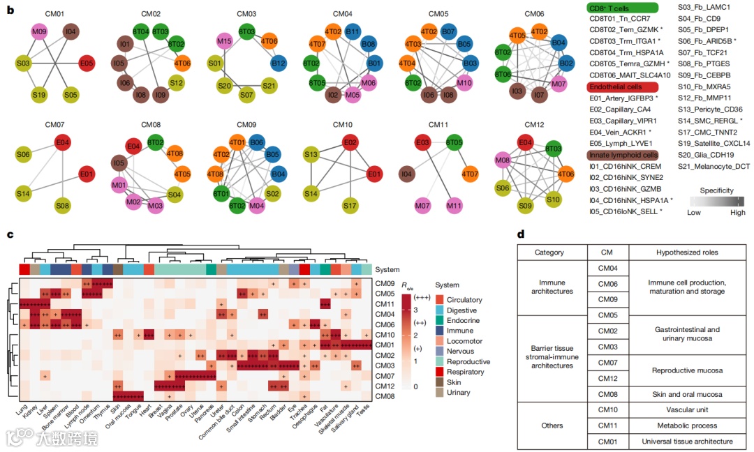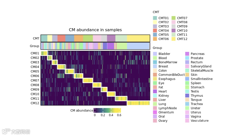 热图展示了细胞模块在不同组织中的活性图谱。每个样本被分配一个主导细胞模块,并且所有样本按其所属的细胞模块类型和组织类型进行排序。