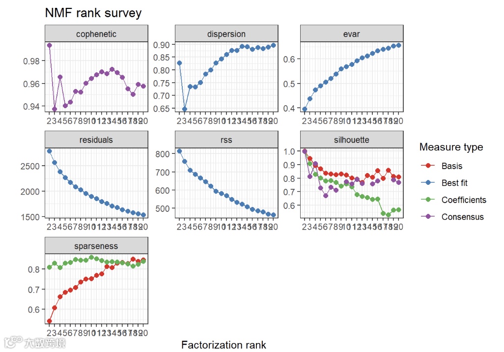 res <- nmf(mat_fq_norm, rank = 2:20, method = "nsNMF", seed = rep(123456, 6), .options = "vp")
