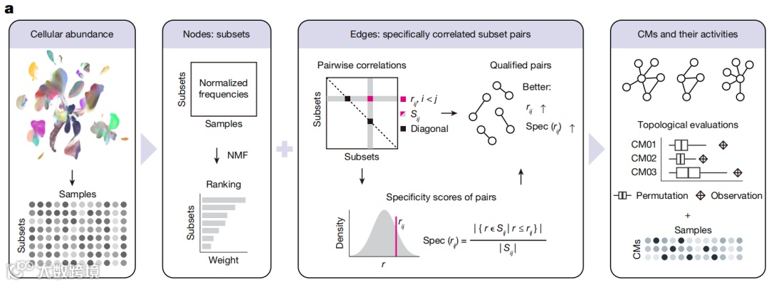 CoVarNet工作流程示意图:CoVarNet通过分析不同样本间细胞亚群频率的协变性来识别共现的细胞模块网络。