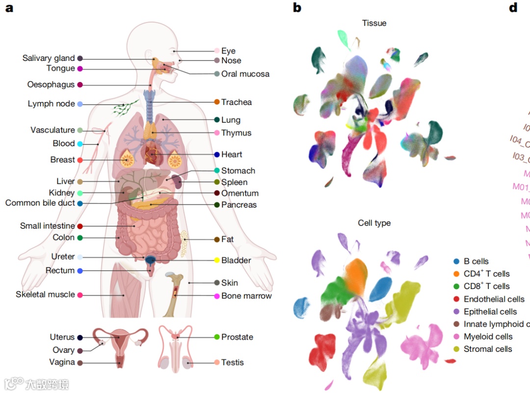 从35个人类组织的706份健康样本中,共获得2,293,951个高质量细胞用于下游分析(图1a,扩展数据图1及补充表1)。利用经典标志物,注释了八个主要的细胞类型(图1b),该图谱揭示了细胞组成中显著的跨组织变异性。