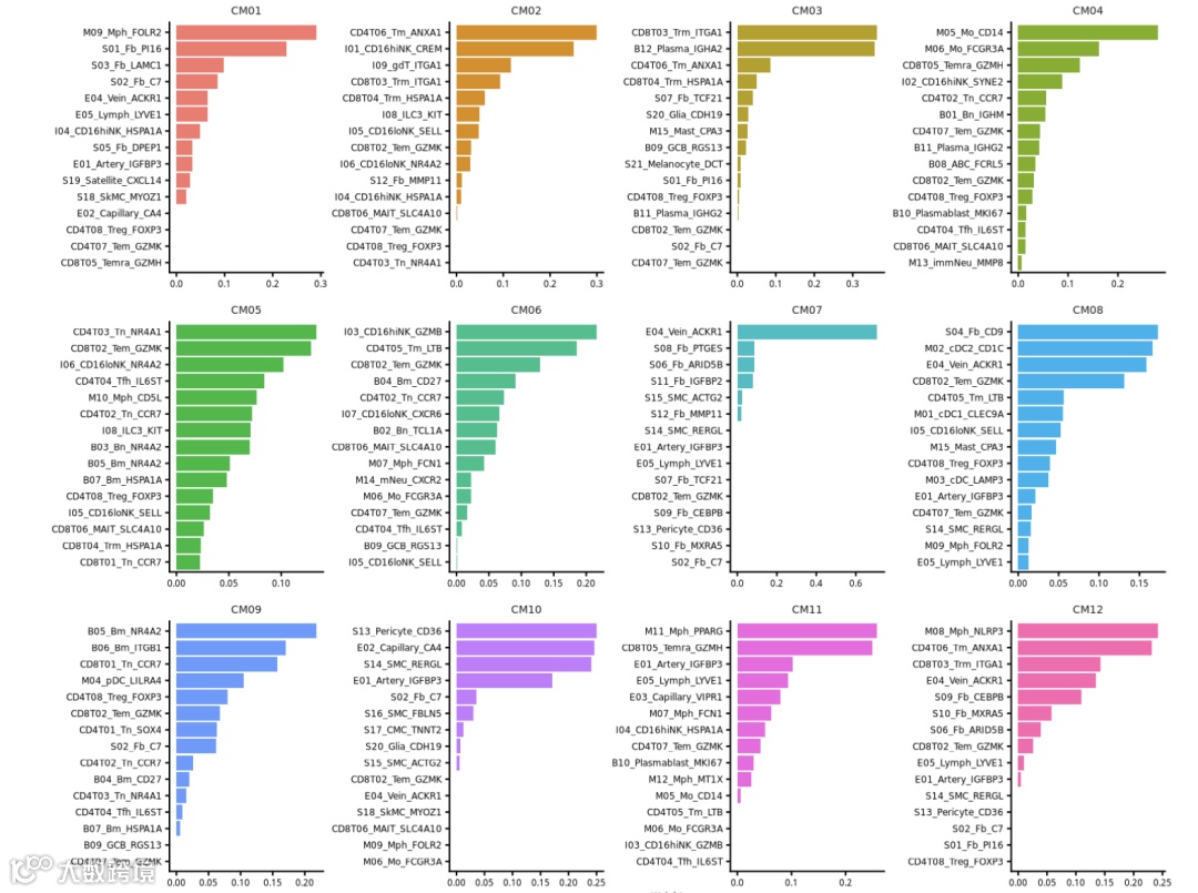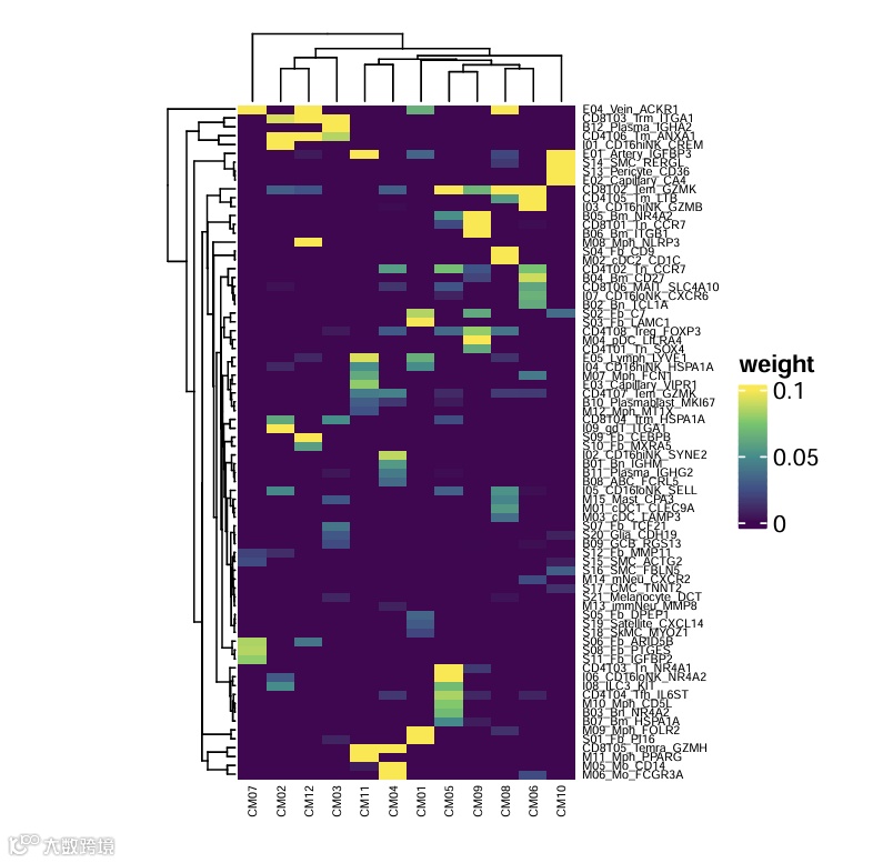 还可以展示细胞模块内按权重排序的top细胞亚群。这些top亚群构成了细胞模块的潜在组成。