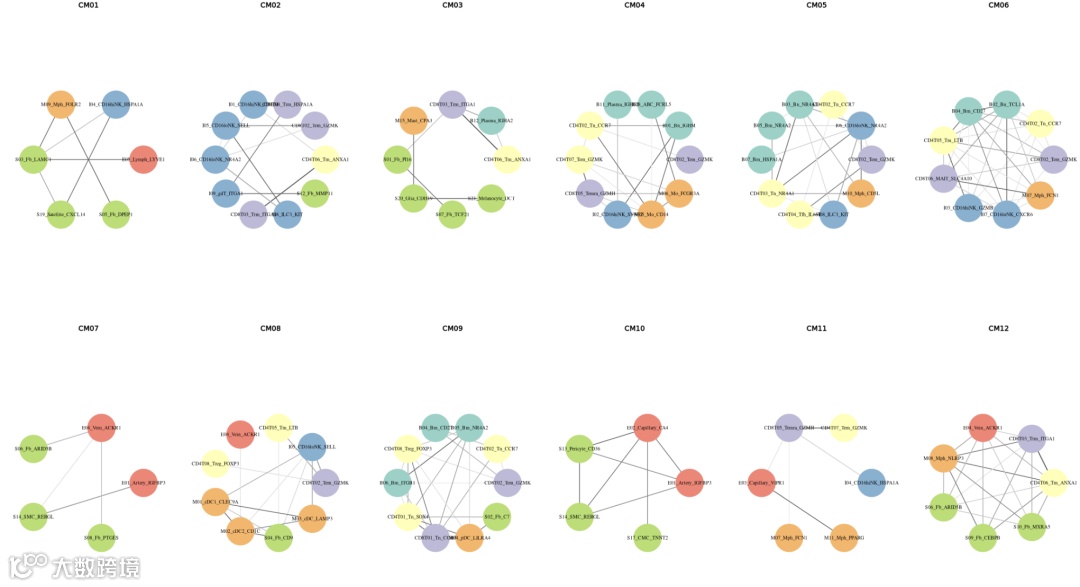 在每个细胞模块网络中,权重最高的细胞亚群被视为潜在节点,特异性相关的亚群对作为边进行连接,并移除孤立节点。