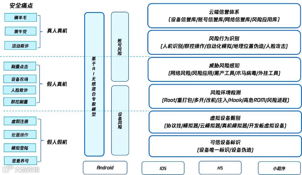设备风控:设备风险检测是基础防线,当前的金融机构发生的风险案例中多数都存在摄像头劫持、屏幕分享、高危 IP 等共性问题,实现人脸核身的安全前置,通过设备安全产品从设备层面进行风控感知,从源头阻断非可信设备发起的攻击或调整人脸核身策略,如root/越狱设备、虚拟机和模拟器、投屏、劫持等风险。例如:腾讯云图灵盾产品,以可信设备标识为基础,结合 AI 无感混合专家模型算法,与实际场景相结合,提供用户设备风险识别能力。