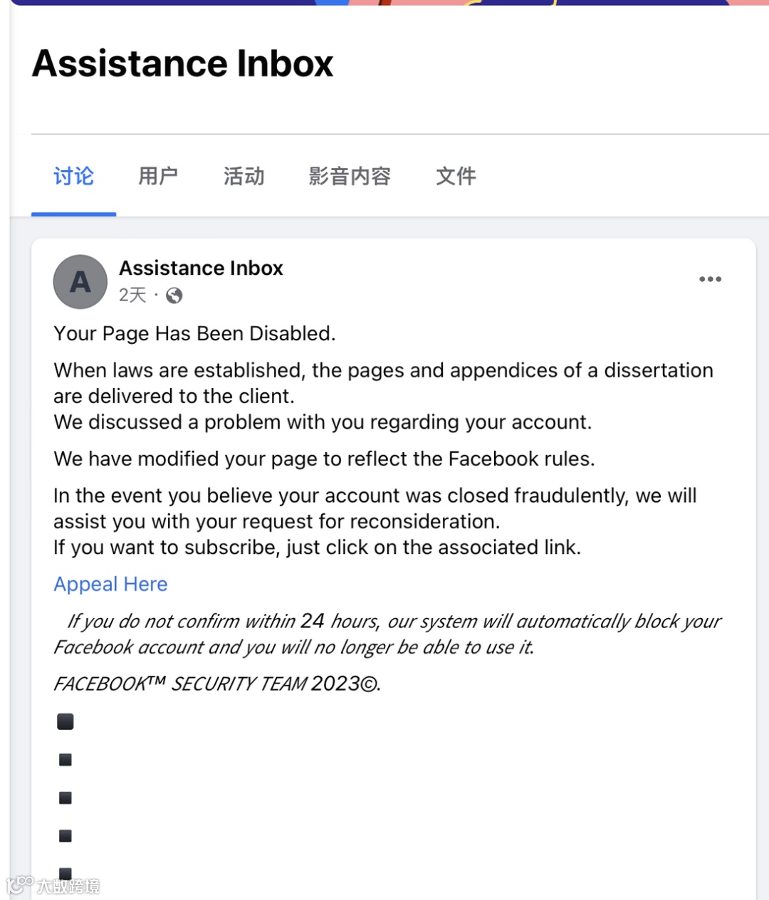 点击邮件后会跳转到Facebook的界面里,大概意思和邮件原本的意思差不多,就是要求你点击链接进行申诉,具体内容如下图所示: