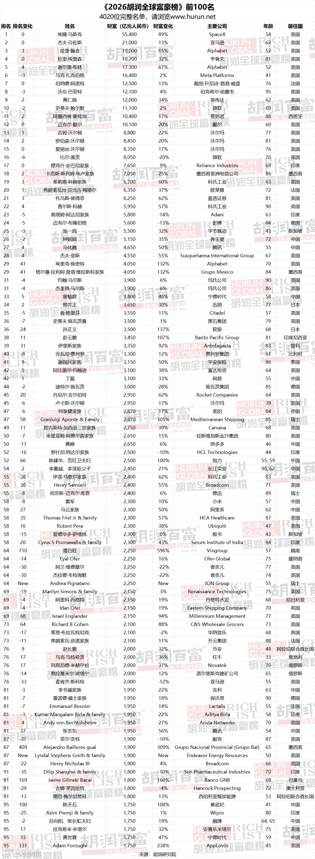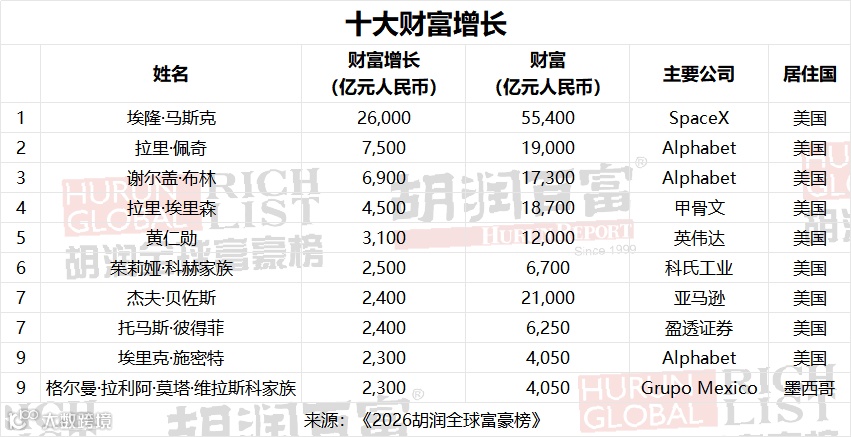 《2026胡润全球富豪榜》前100名