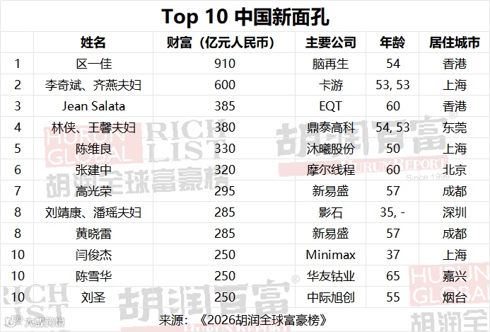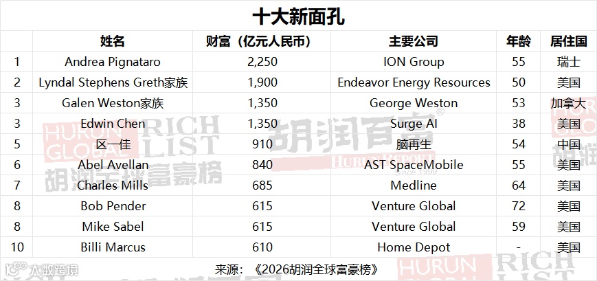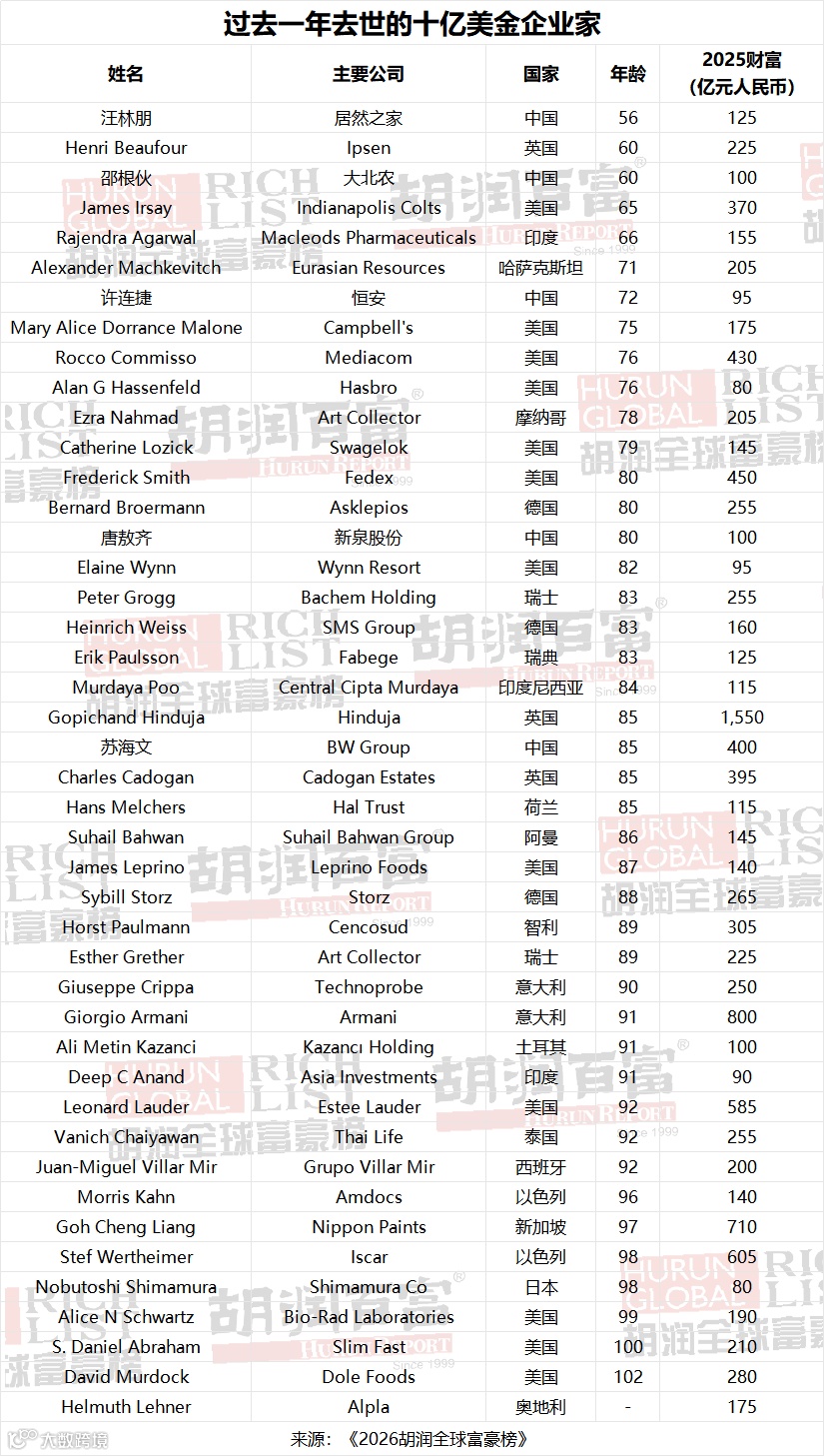 作为《2026胡润全球富豪榜》的组成部分,共有28人通过继承家族企业跻身十亿美金企业家俱乐部。其中,四位继承者跻身新上榜者前十名。