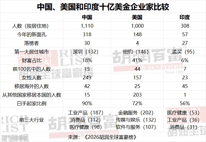 “中国重新超越美国,夺回‘十亿美金企业家第一大国’的桂冠。中国十亿美金企业家数量突破1100位,比去年增加近300位,这一增幅不仅完全扭转了过去三年的下滑态势,更实现了逆势大幅增长。如今中国75%的十亿美金企业家,十年前均未跻身榜单,这一数据深刻反映了财富格局的巨变。‘全球化’成为本年度中国企业家的创富热词。从行业分布来看,工业产品领域表现最为亮眼,新上榜人数超80位;半导体行业紧随其后,新增18位十亿美金企业家,这一成果直接得益于中国推动芯片自主化的战略布局,其中沐曦股份的陈维良财富330亿元人民币、摩尔线程的张建中财富320亿元人民币,为该领域的代表人物;医疗健康领域新增28位上榜者,合计财富达3500亿元人民币,脑再生的区一佳以910亿元人民币财富领跑该领域;能源领域受益于新能源汽车电池生态的蓬勃发展,新增19位十亿美金企业家;AI领域同样有两位新人上榜,分别是Minimax的闫俊杰,财富250亿元人民币,与智谱的刘德兵,财富85亿元人民币。从地域分布来看,深圳以近50位新上榜者居首,上海、杭州、苏州紧随其后。”