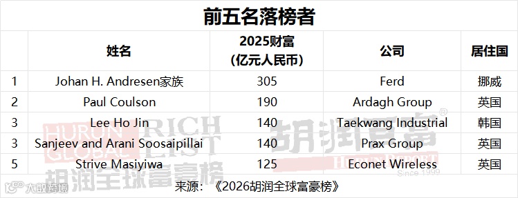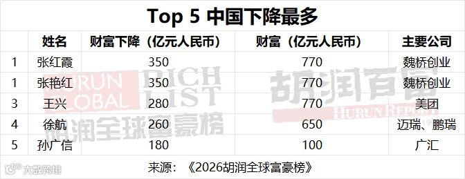 在中国,乌鲁木齐主营汽车销售、能源、房地产等板块的广汇集团的孙广信,财富较去年下降65%至100亿元人民币,主要原因在于受行业周期下行、前期高杠杆扩张、多板块业务承压等因素影响,集团经营面临阶段性调整压力。上海房地产企业世茂的许荣茂,受房地产行业低迷影响持续亏损,财富下降超50%至110亿元人民币。北京商业地产万达的王健林,受商业地产下行、债务压力与资产处置影响,经营面临阶段性挑战,财富下降48%至100亿元人民币。