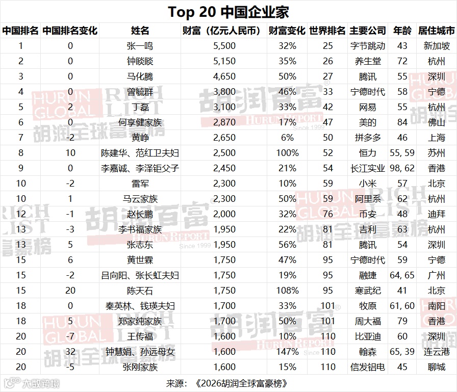 (2026年3月5日,中国上海、印度孟买和英国牛津)提供有质量的榜单与调研的胡润研究院今日发布《2026胡润全球富豪榜》(Hurun Global Rich List 2026)。财富计算的截止日期为2026年1月15日。这是胡润研究院连续第15年发布“全球富豪榜”。