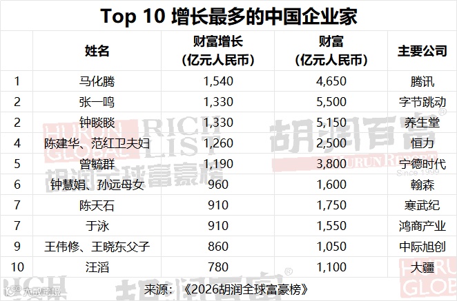 前十名新增财富5.3万亿元人民币,占新增财富总额的19%,总财富20万亿元人民币,占总榜单的13%。