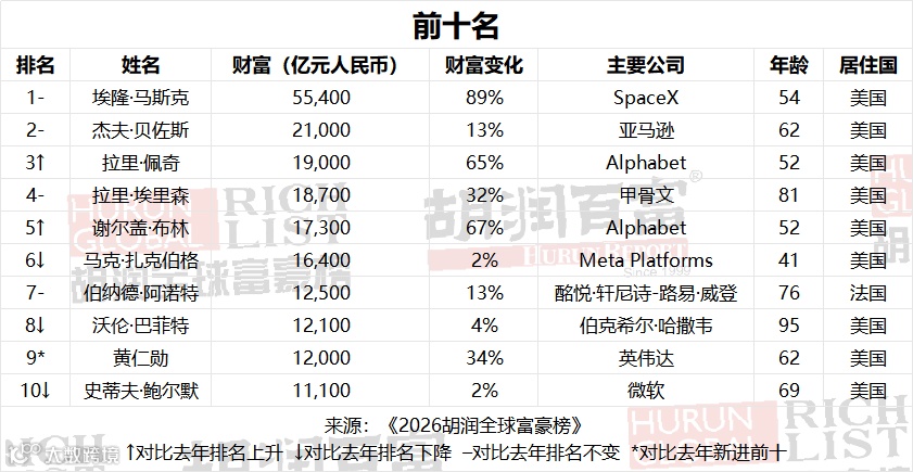 《2026胡润全球富豪榜》前十名