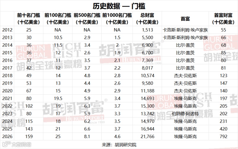 进入胡润全球富豪榜前十的门槛每五年翻一番,从十年前的2400亿元人民币到五年前的5200亿元人民币,再到今年的1.1万亿元人民币。