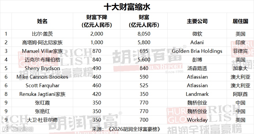 其余企业家的大额财富缩水均为非自愿所致。高塔姆·阿达尼财富减少1000亿元至5800亿元人民币——其旗下企业先是在2024年11月遭纽约联邦法院起诉,被控存在行贿及投资者欺诈行为,后又在2026年2月因涉嫌违反伊朗制裁规定,受到美国财政部调查;双重打击下,其集团股价暴跌,数十亿美元的国际合作项目也宣告夭折。菲律宾的Manuel Villar受本土房地产市场低迷影响,旗下地产帝国遭遇冲击,财富减少870亿元,至695亿元人民币。受AI技术替代的市场担忧影响,Atlassian公司股价暴跌三分之一,联合创始人Mike Cannon-Brookes与Scott Farquhar的财富均缩水460亿元人民币,至550亿元人民币左右。Renuka Jagtiani的财富缩水幅度占比最大,超半数财富缩水后仅剩350亿元人民币,其旗下的Landmark集团 零售帝国正面临巨大的经营压力。