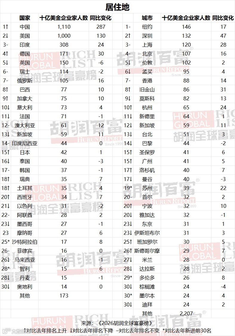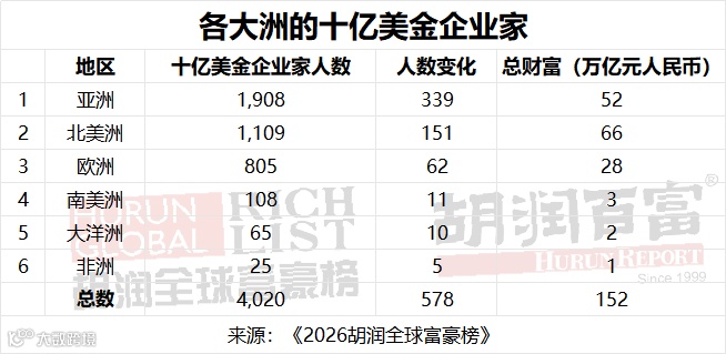 《2026胡润全球富豪榜》列出了来自2914家公司、73个国家的4020位十亿美金企业家,比去年的3442位增加了17%。总财富增加了28%。