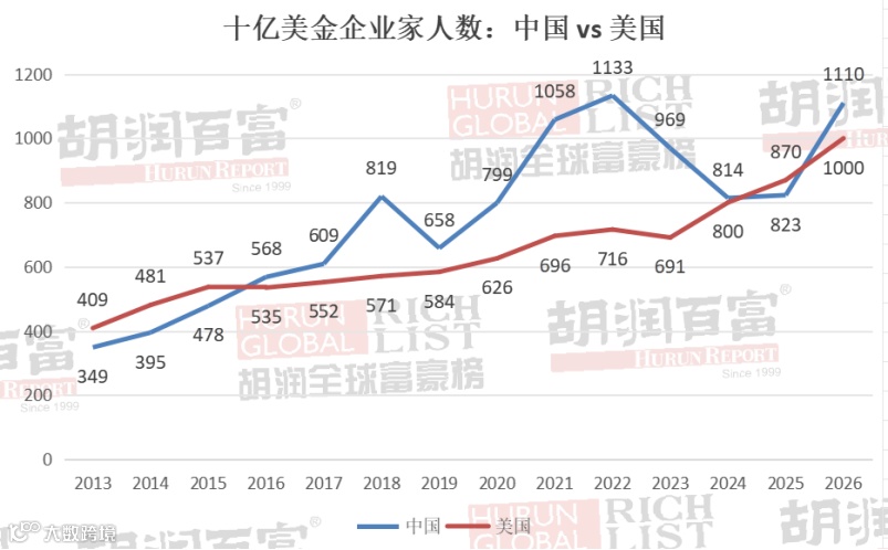 中国重回全球第一,以1110位十亿美金企业家领跑全球,增加287位,美国以1000位位居次席,增加130位