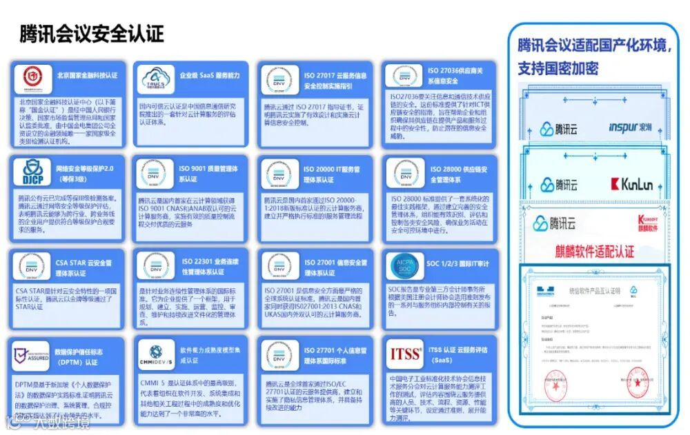 腾讯会议高度重视产品的安全认证、安全合规以及积极参与国产平台的适配工作,能够满足金融机构需要适配国产环境和对产品安全高要求的需求。目前腾讯会议产品已获得网络安全等级保护(三级)测评,可信云认证,并且通过了北京国家金融科技认证。可信云评估是由中国信息通信研究院组织发起的,国内唯一针对云服务的权威评估体系,腾讯会议获得此认证。腾讯公司每年委托公安部信息安全等级保护评估中心对重要信息系统实施网络安全等级保护测评,目前通过网络安全等级保护(三级)测评。北京国家金融科技认证中心(以下简称“国金认证”)是经中国人民银行决策、国家市场监督管理总局和国家认监委批准,由中国金电集团公司全资设立的金融领域唯一一家国家级全类别检测认证机构,腾讯会议通过了此认证。