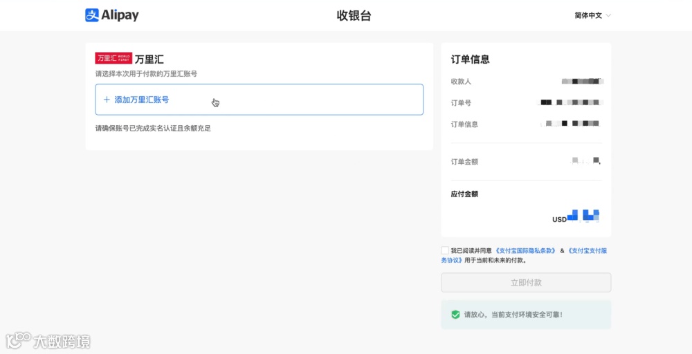 添加万里汇(WorldFirst)账户作为支付渠道选项,点击立即付款即可闪速支付哦。