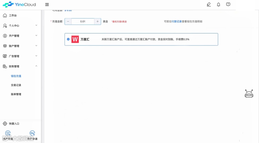 登录YinoCloud易诺云后台,在“财务管理”>“钱包充值”页面选择万里汇(WorldFirst)。