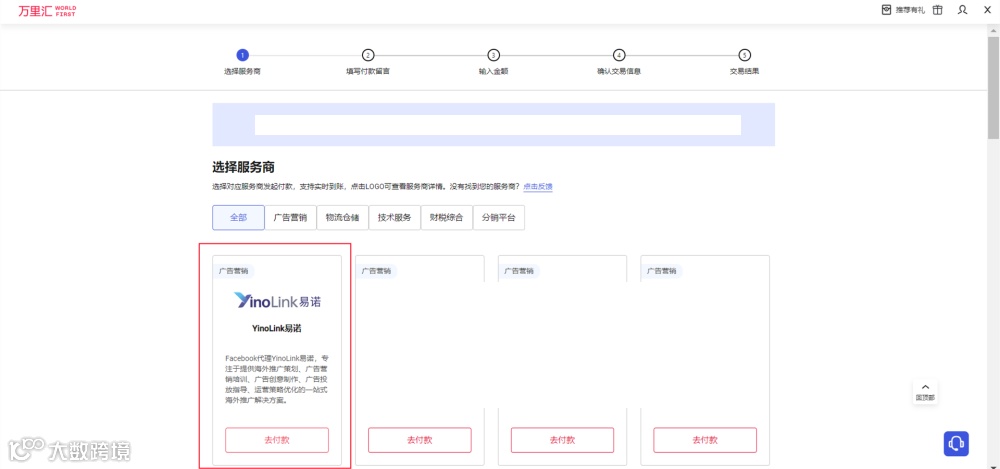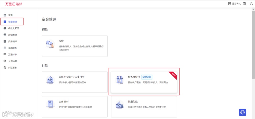 登录您的万里汇账户,在账户后台选择“资金管理”>“服务商快付”>“广告营销”。