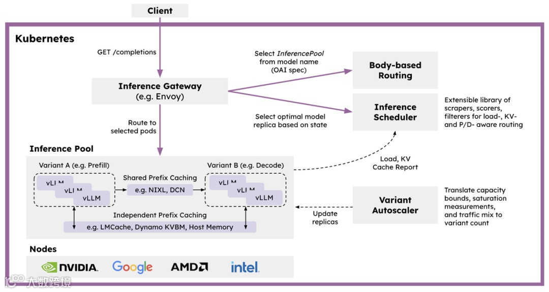 llm-d 介绍: 是一个原生于 Kubernetes 的高性能分布式 LLM 推理框架,能够以最快的速度实现价值,并提供极具竞争力的性价比。llm-d 基于 vLLM、Kubernetes 和推理网关构建,提供模块化的分布式推理解决方案,并具备键值缓存感知路由和解耦服务等特性。