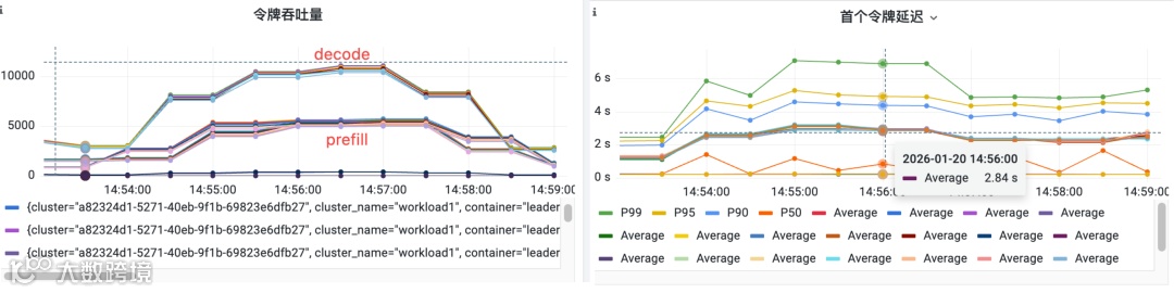 监控数据: 下面是从监控中查看P/D 每个 Engine 的吞吐数据、TTFT 数据,都是看到也是满足 SLA 的,首 Token 延迟稳定在 2.84s 左右 (P90) 。