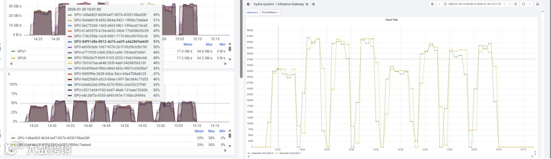 Prefill 服务中的 GPU SM Activity 也能到 50%,NVLink RX/TX 都能到30GB/s;Prefill 和 Decode 节点的负载也比较稳定和均衡。