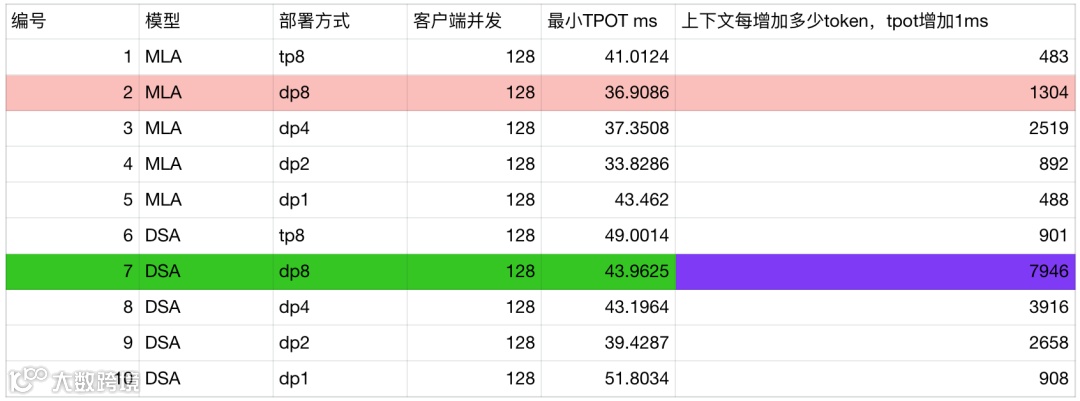 1、关于不同部署方式,MLA 与 DSA 模型的性能对比分析(编号 2 和 7 组)