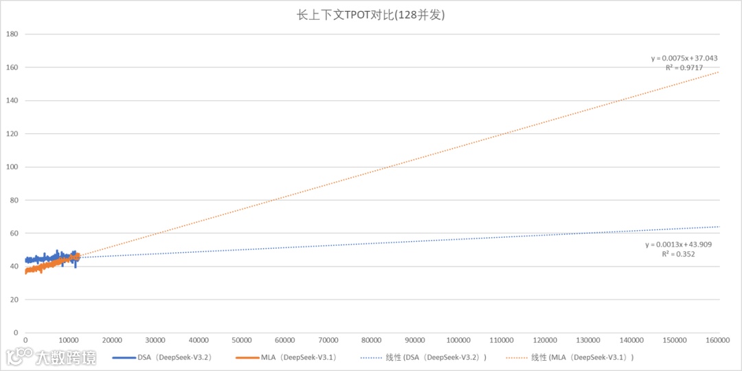 最小延迟对比:在输入长度极短(上下文长度为1)时,MLA 模型的 TPOT 为 37ms,优于 DSA 模型的 44ms。