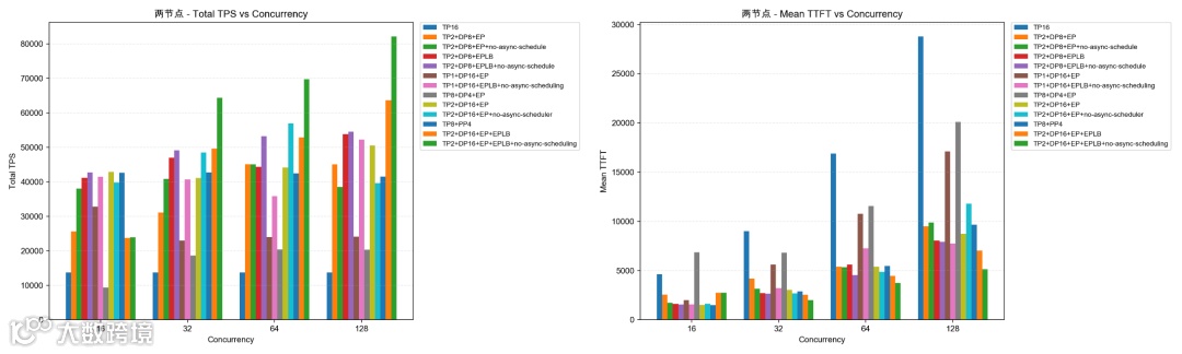 单节点显存容易耗尽 KV Cache导致 OOM,双节点提供了更大的 KV Cache 空间以支持高并发 Decode 。