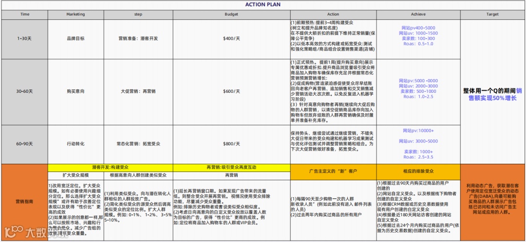 YinoLink易诺在报告中分享了适用于服装、珠宝饰品品类的阶段性广告营销计划,拆解市场目标、日预算、具体营销行为以及阶段性数据目标,实现一个季度增长50%销售额,点击文末阅读原文查看高清图片。