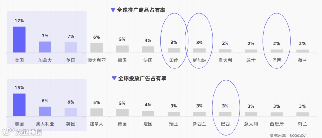 整体来看,Q1全球电商推广商品量呈上升趋势,3月新上商品占比高达7成。Q1全球主要国家推广商品占有率和投放广告占有率欧美国家占比最高,美国、加拿大、英国稳定在前5。此外,印度、巴西、新加坡等新兴市场也值得关注。