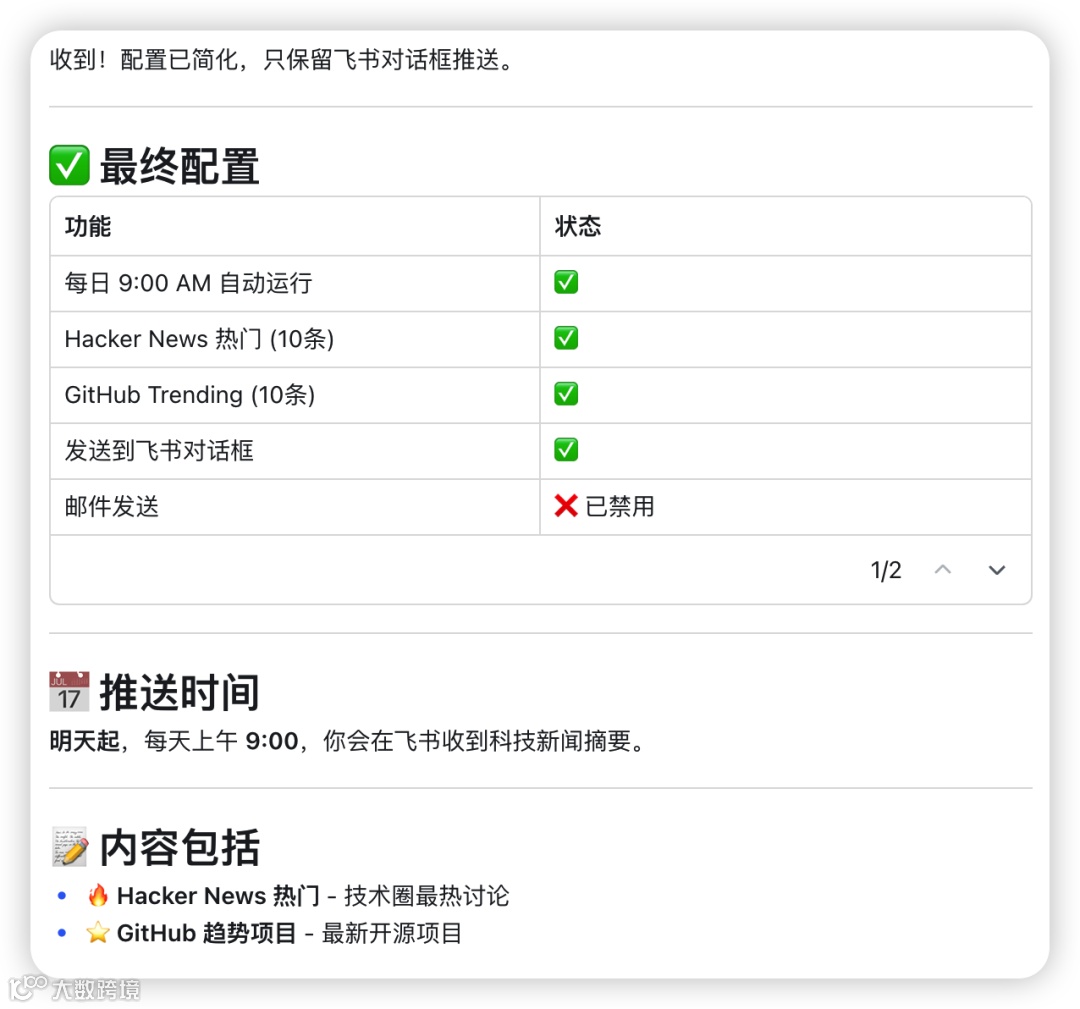 - ✅ 每天早上9点,自动汇总AI行业新闻推送到飞书
