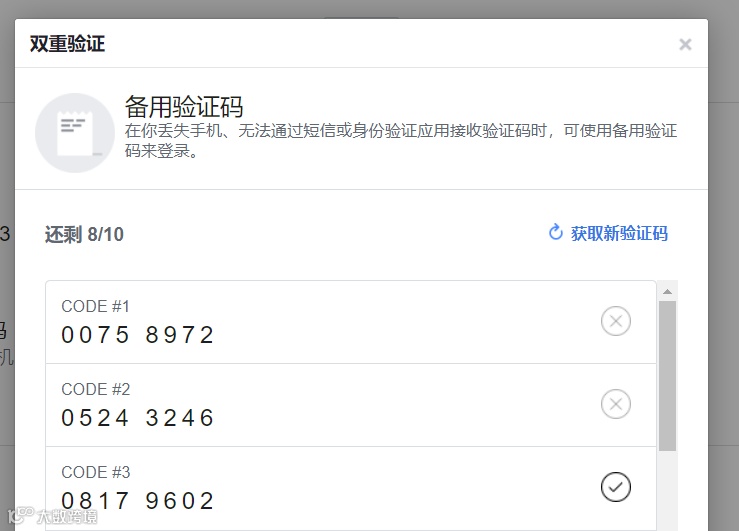 A:10个备用验证码用完后可以点击“获取新验证码”申请新的备用验证码。