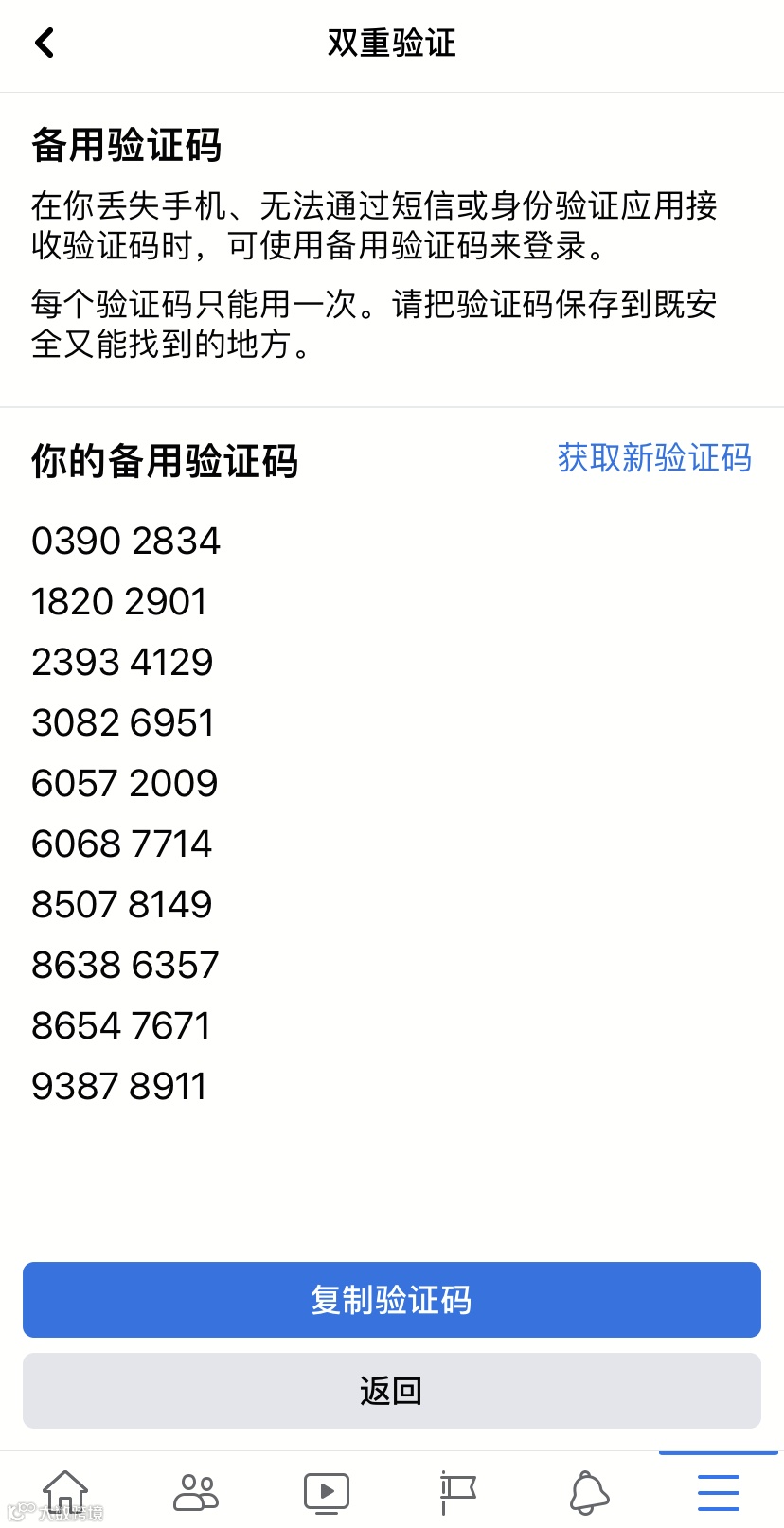 第七步:会出现10个备用验证码,可以记录或截屏保存。