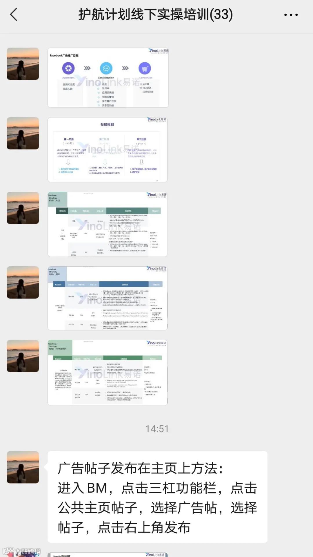 Facebook官方代理商YinoLink易诺会在学习群里同步课程重点信息,方便大家记录和操作。让小白学员对独立站运营和推广有了方向和目标,也让已有运营经验的学员的运营技巧得到了提升。
