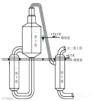 该设备安装情况:支座采用焊接形式点焊在高程为13.1m的钢架梁上,90°支座与二效脱酚塔上塔一支座相连接(见图3)。液相连接管与一效下塔相连接,汽相连接管与二效下塔相连接(见图4)。