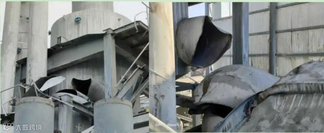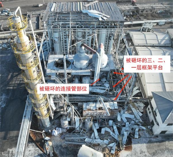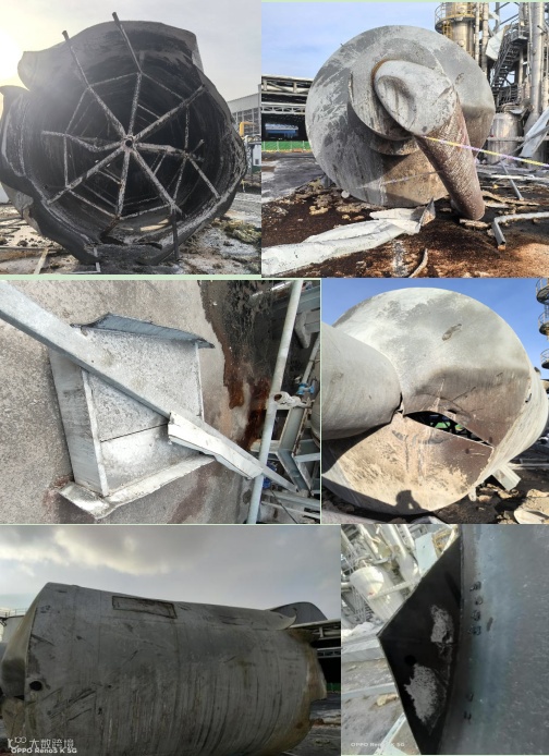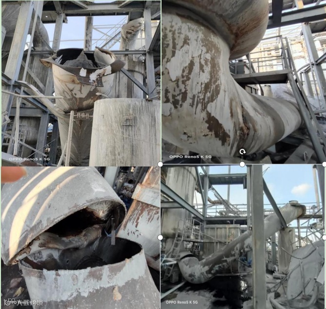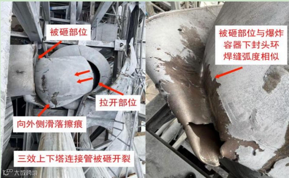 (1)最大部分(爆炸物6)包含了筒体、上锥形封头、部分一效脱酚塔上塔至二效下塔的连接管及一块下锥形封头残留件,跌落至装置区外。爆炸物6有一处距离90°支座顺时针方向200mm,从下锥大端沿一纵向焊缝向外翻的开裂,长度为1100mm;在筒体与一效下塔上部连接管道开孔处有一约470mm×230mm的缺口。四个支座中,一个与二效脱酚塔上塔支座的连接件落至装置区内地坪上,其余三个均附带在筒体上。受爆炸后摔落冲击影响,筒体部分部位内凹变形,上封头一处受撞击内凹,焊缝部位开裂,上部接管第1个弯头严重变形。两个视镜中,一个视镜完全损毁。进水管、进碱液管、液位计接管均脱落(见图10)。