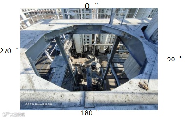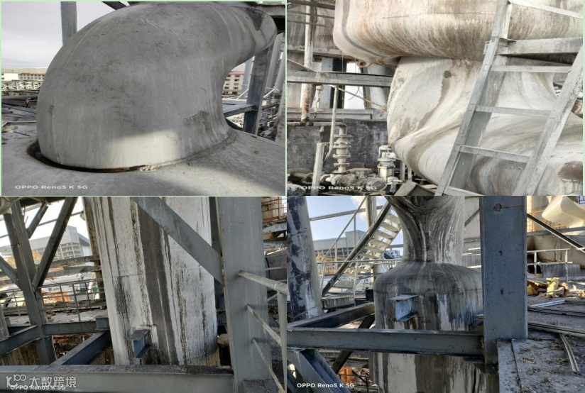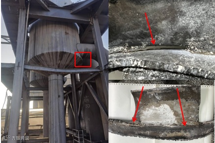 (1)一效下塔上、下封头与弯头连接处部分内凹严重,两个支座脱离钢架梁抬高架空,塔体整体倾斜(见图13)。